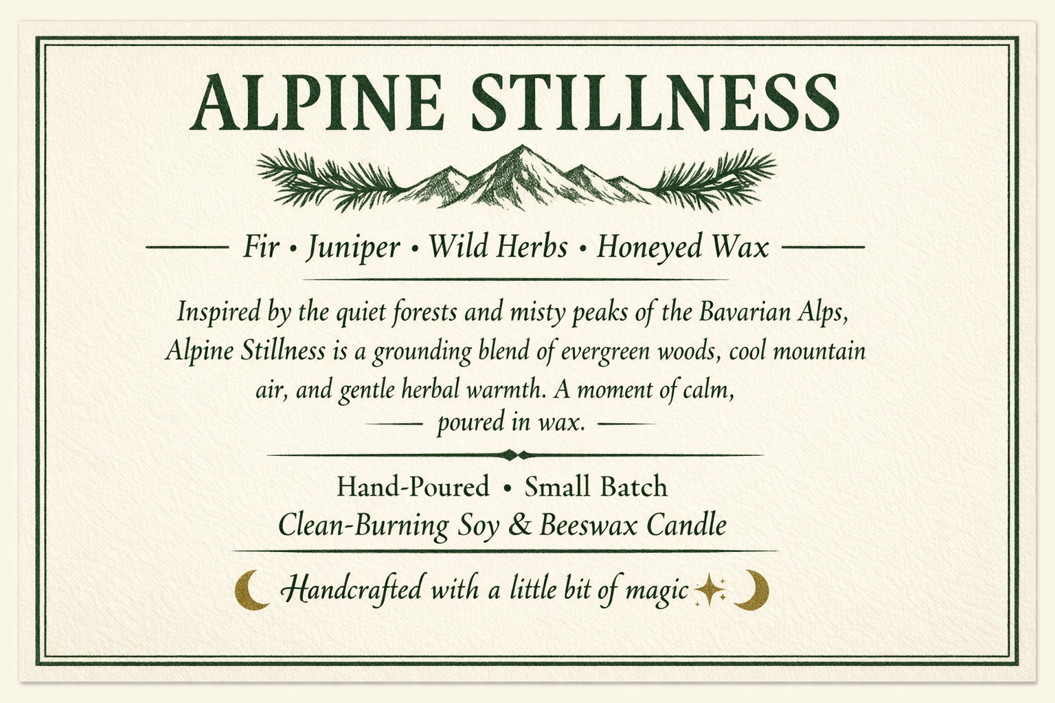 Step into the quiet of the mountains with Alpine Stillness, a candle inspired by mist-covered forests, evergreen slopes, and the peaceful hush of the Bavarian Alps. Crisp fir needle and juniper open the scent with cool alpine air, while wild herbs and soft lavender weave a gentle, grounding heart. A subtle touch of honeyed wax and warm woods settles in last, like candlelight glowing in a mountain chalet at dusk.
