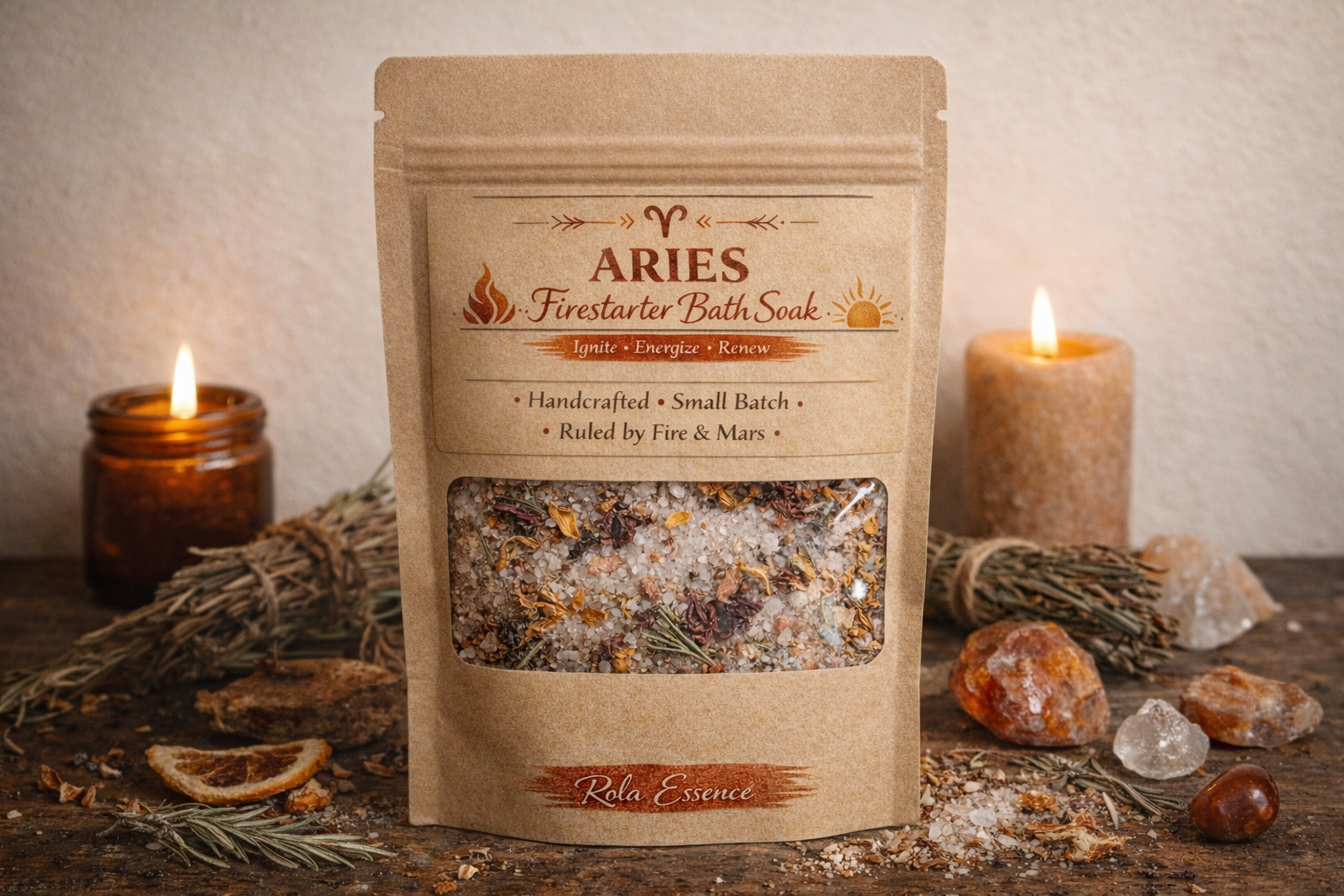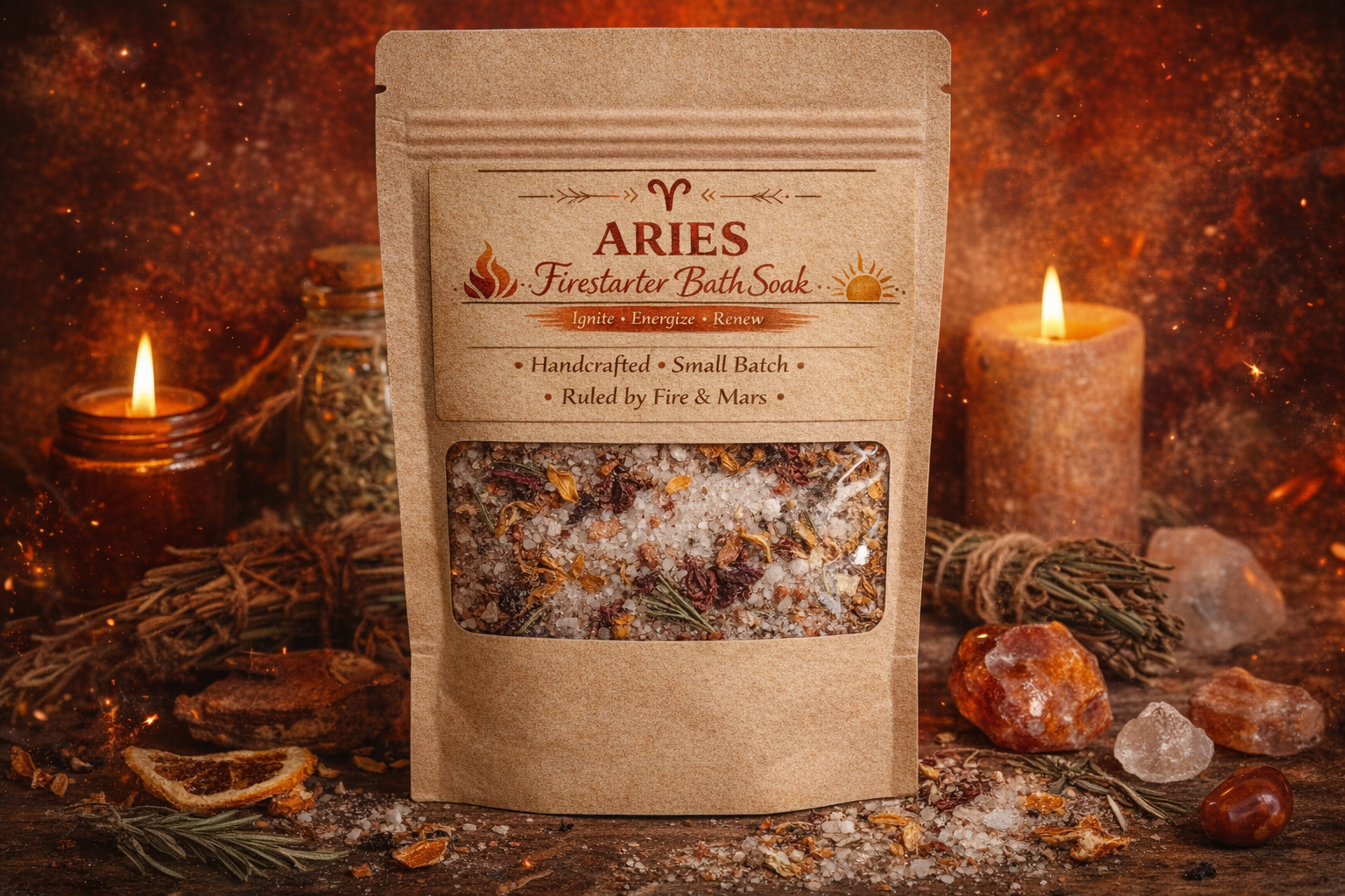 Ignite your inner spark with Aries Firestarter Bath Soak, a bold botanical blend crafted to awaken confidence, restore energy, and inspire fresh beginnings. Infused with mineral-rich salts and fire-aligned herbs, this soak transforms your bath into a grounding yet energizing ritual—perfect for moments when you’re ready to move forward with clarity and courage.