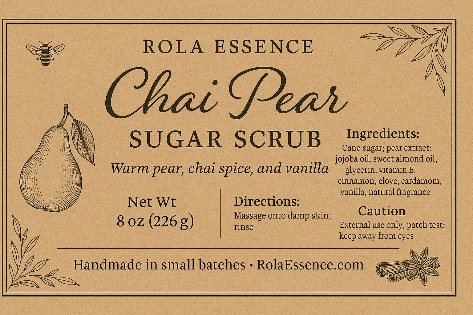 Transform your daily routine into a cozy ritual with our Chai Pear Reverie Sugar Scrub. Fine cane and brown sugars buff away dryness while aromatic chai spices—cinnamon, cardamom, ginger, and clove—awaken your senses. Luscious pear purée and a nourishing blend of coconut, almond, and jojoba oils melt on contact to hydrate and condition, leaving skin silky-smooth and delicately scented with warm spice and sweet orchard fruit.