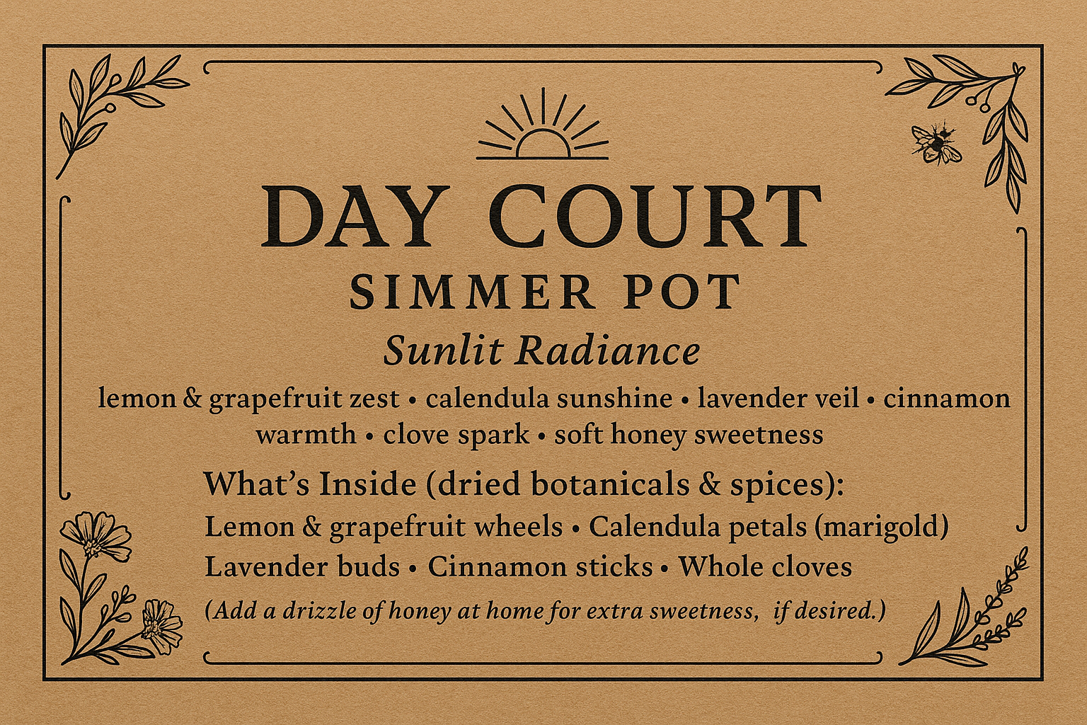 Step into the brilliance of the Day Court, where golden sunlight floods marble halls and every breath feels like inspiration. This hand-blended simmer pot captures the court’s radiant energy, weaving together bright citrus, golden florals, and warm spices for a fragrance that awakens the spirit and fills your home with light.