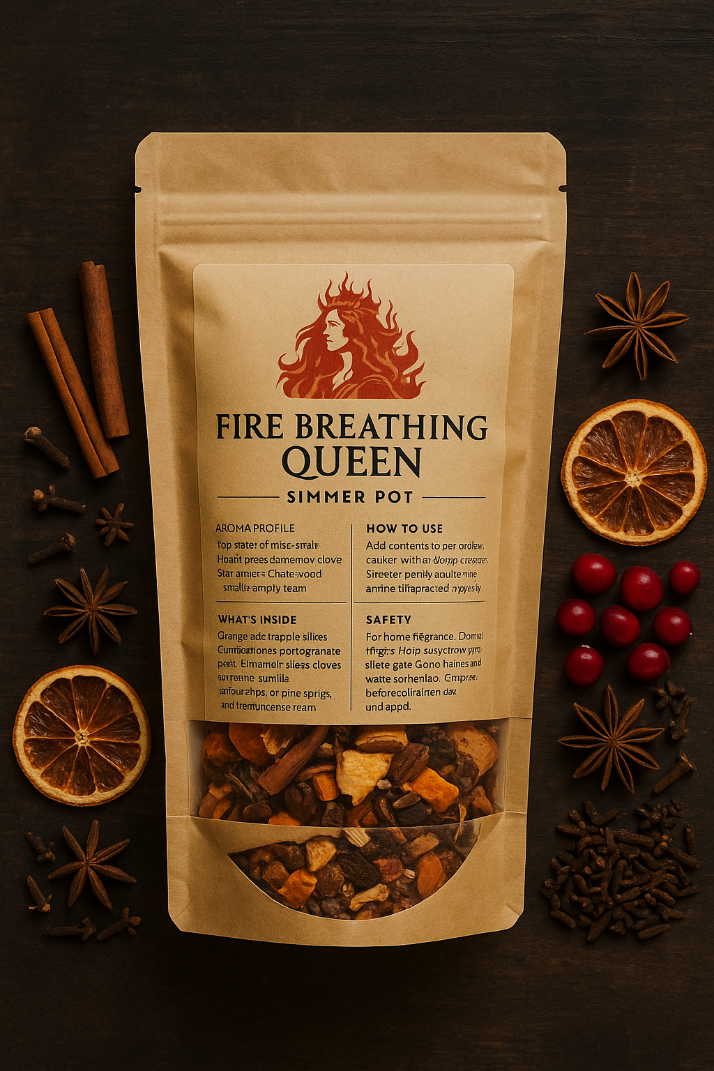 Orange peel, apple slices, cranberries or pomegranate peel, cinnamon sticks, cloves, star anise, vanilla, cedar chips or pine sprigs, and a hint of frankincense resin. Each botanical chosen to reflect fire, power, and the unshakable spirit of the queen who breathes flame.