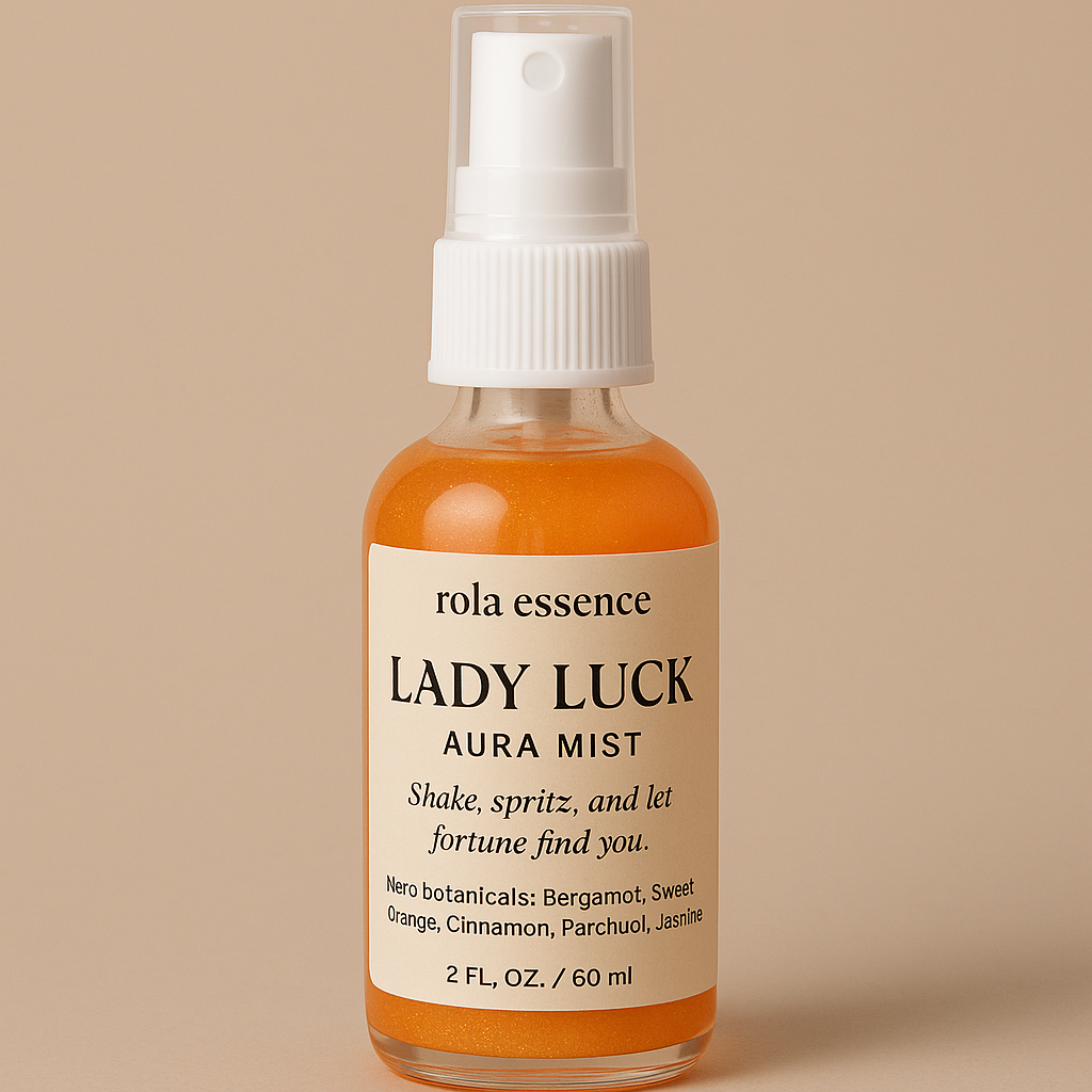 A sparkling orange aura spray infused with sweet orange, bergamot, cinnamon, jasmine, and patchouli to uplift the senses and call fortune your way.