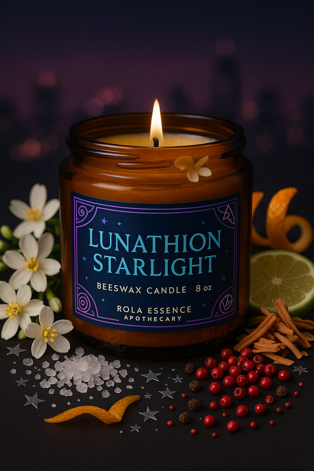 Crafted from pure golden beeswax and softened with coconut oil, this candle burns clean and steady, releasing a fragrance as enchanting as the city itself. The scent blend awakens with the intoxicating bloom of night jasmine, carried by a whisper of sea salt and ozone, deepened by warm amber and a grounding trail of incense and cedarwood. Together, they capture the pulse of Lunathion—mystical, sultry, and alive with possibility.