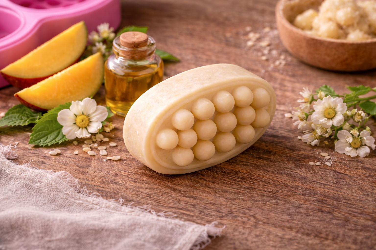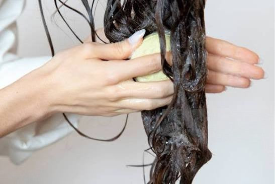 After shampooing, glide the bar directly onto wet hair, focusing on mid-lengths and ends. Massage through, allow to sit 2–3 minutes, then rinse thoroughly. Store in a dry place between uses.
