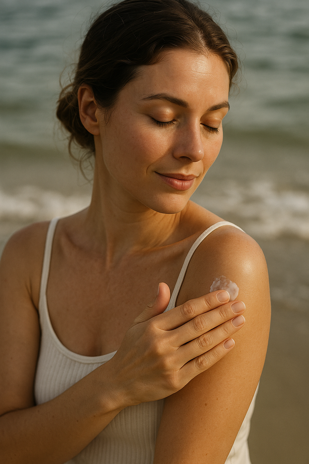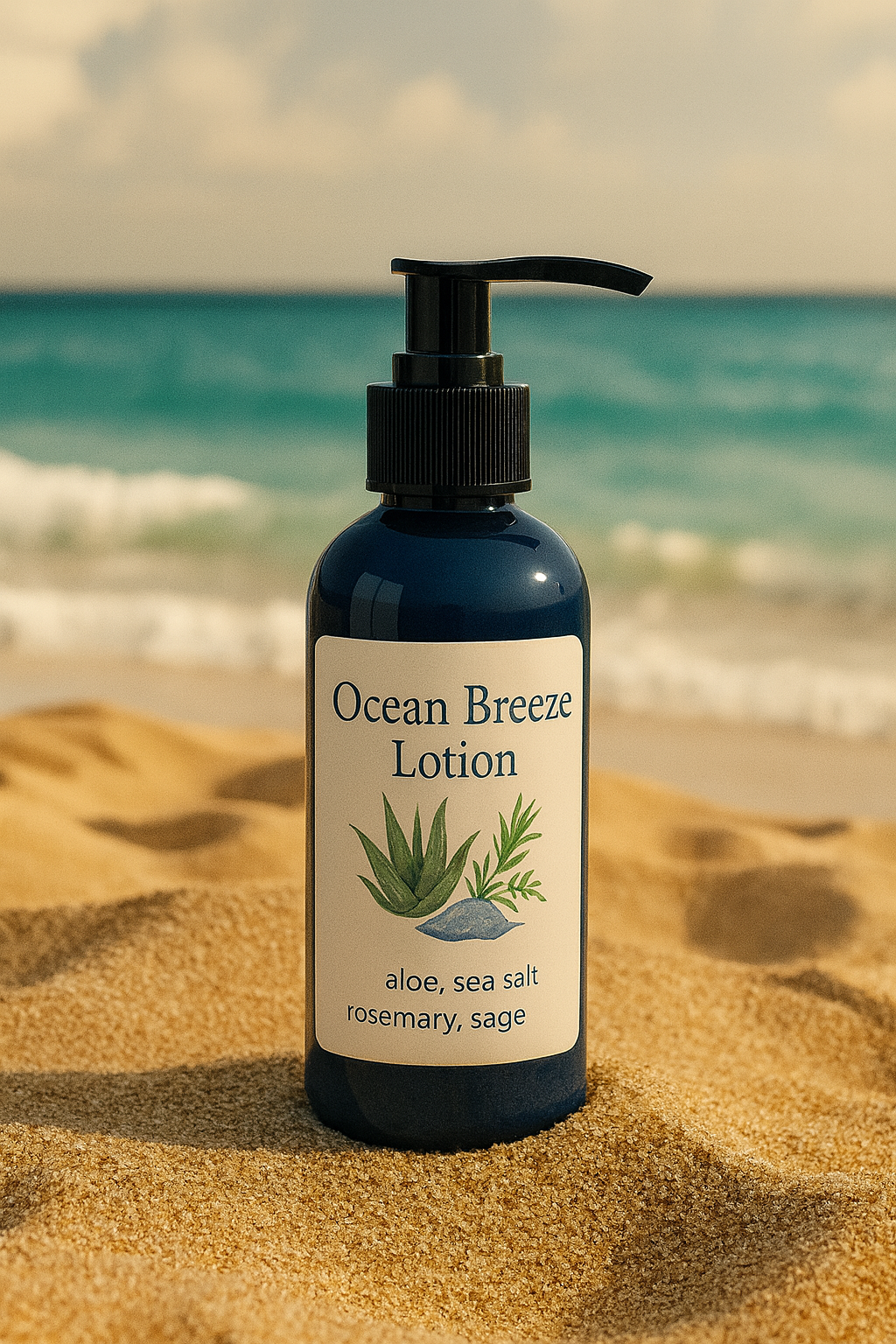 Ocean Breeze Lotion delivers a refreshing wave of hydration for all skin types. This lightweight, fast-absorbing formula is infused with aloe, sea salt minerals, rosemary, and sage—ingredients known for soothing, cooling, and revitalizing the skin.