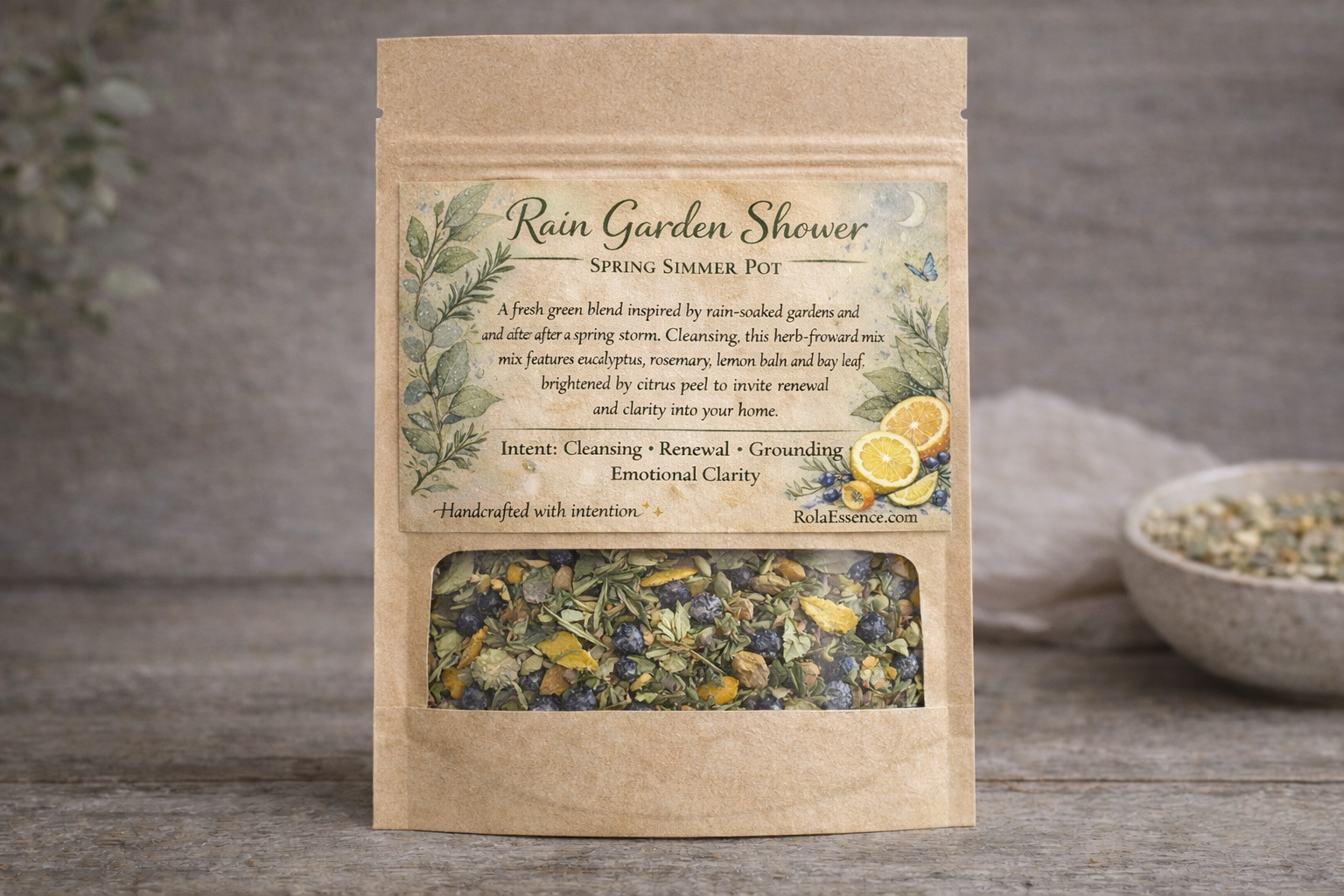 Step into the calm that follows a spring rain. Rain Garden Shower is a fresh, green simmer pot inspired by rain-soaked gardens, misty air, and citrus trees glistening after a storm. As it gently simmers, this herb-forward blend fills your space with a clean, comforting aroma that feels like opening a window during a soft April shower.