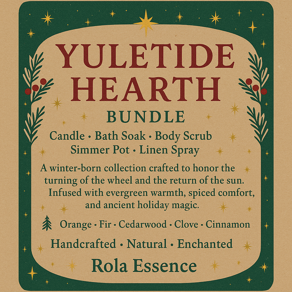 This bundle includes five handcrafted treasures — the Yule Blessing Candle, Yuletide Glow Body Scrub, Yuletide Hearth Bath Soak, Yule Hearth Simmer Pot, and Hearth & Evergreen Linen Spray — all infused with bright orange peel, deep fir, warm cedarwood, clove, and cinnamon. Together they create a comforting ritual of warmth, renewal, and evergreen protection.